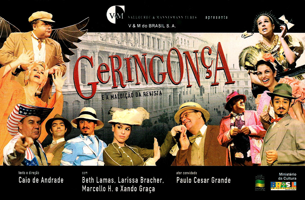 1908 – o ano da morte do grande dramaturgo Arthur Azevedo é ponto de partida para uma divertida “Revista de Ano” que tem como objetivo homenageá-lo. Partindo da estrutura revisteira, Caio de Andrade criou uma divertida comédia recheada de música, personagens alegóricos e inusitadas situações que contam, entre números de cortina e outros artifícios, a saga de uma companhia de teatro falida que precisa montar uma “Revista de Ano” para continuar existindo. Alegria, humor e uma boa dose de irreverência fizeram de “Geringonça” um grande sucesso da temporada carioca.